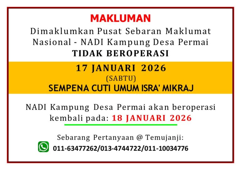 sempena cuti umum Isra’ Mikraj pada 17 Januari 2026 (Sabtu) dan akan kembali beroperasi seperti biasa pada 18 Januari 2026 (Ahad).